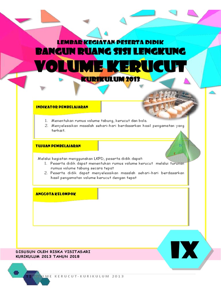 R = 5 cm, t = 22 cm dit : Volume kerucut (vb) vb = π x r2 x t x 1/3. Kemasan tersebut terdiri atas bangun gabungan tabung dan kerucut. Berbeda dengan tabung yang memiliki tiga sisi, kerucut hanya memiliki dua sisi, yaitu sisi alas dan sisi selimut. Volume benda tersebut adalah …